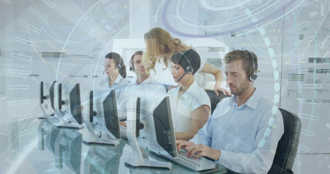 Various team members wearing phone headphones collaborate at a long desk with flat monitors in a sleek and modern office setting. A distinct overlay of digital data and graphical elements emphasizes the busy environment. Useful for illustrating concepts related to customer service, teamwork, corporate technology, and futuristic workplaces.