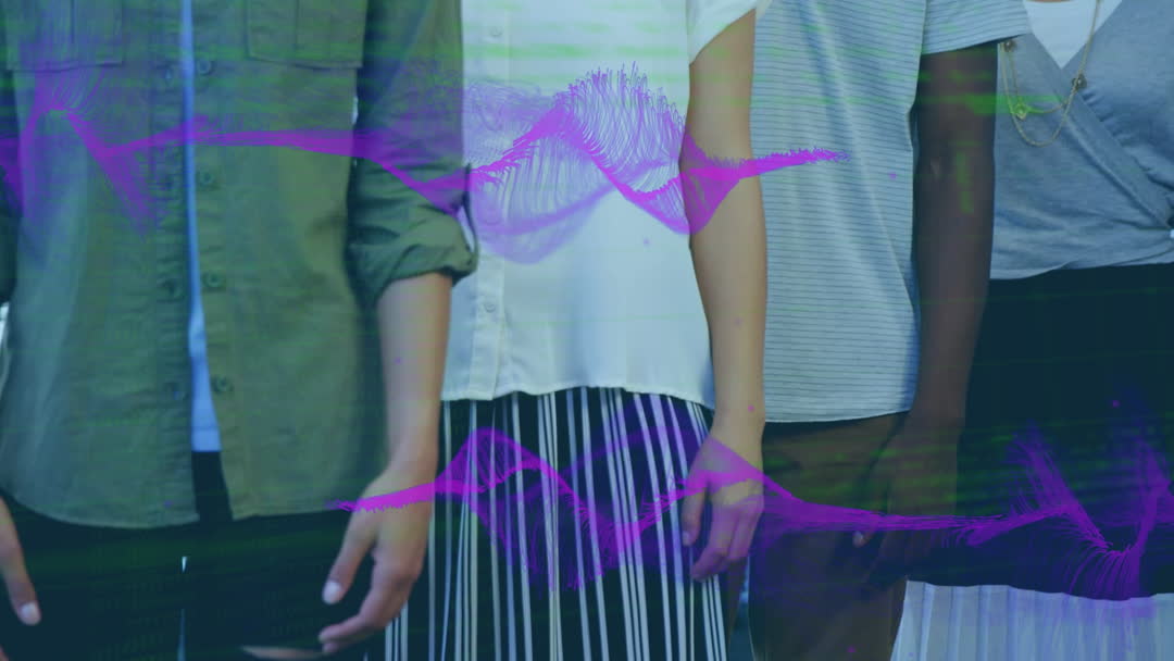 Group of diverse coworkers shown from midsection, with dynamic purple waves and digital elements superimposed. Symbolizes mixed team dynamics in modern tech environment, suitable for illustrating concepts of teamwork, diversity, innovation, digital transformation, or collaborative workspace in a digital era.