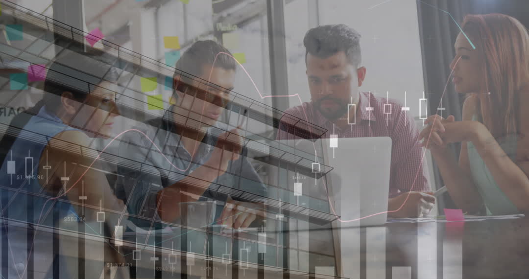 Multiracial group collaborates using a laptop, overlaid with financial charts and graphs. Ideal for illustrating concepts of teamwork in finance, global business strategies, and modern technology integration.