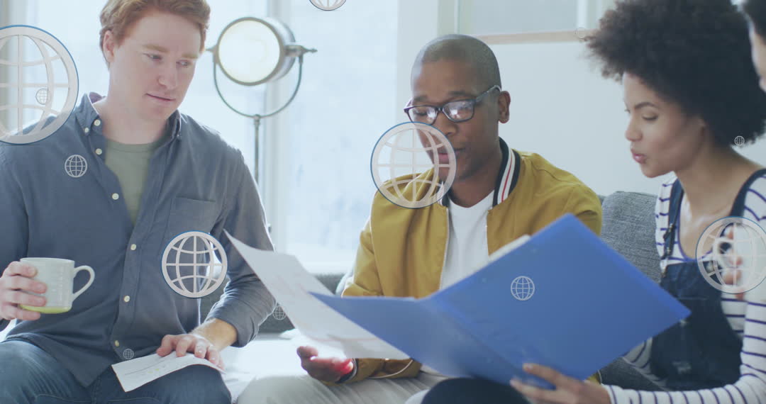 Group of diverse colleagues focused on analysis in office. Digital globe icons depict global connectivity, was engaged in reviewing documents and discussing ideas. Useful for illustrating teamwork, global businesses, or modern collaborative environments.