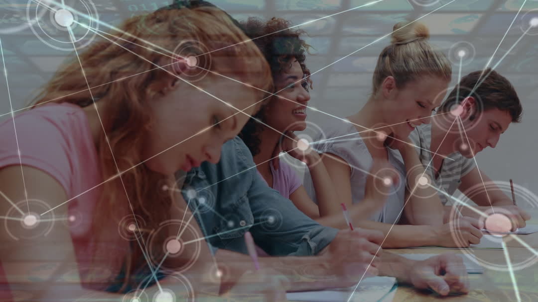 Students in a lively classroom setting are focused on their work, with a digital network overlay suggesting integration of technology in education. Useful for illustrations about academic advancements, educational technology solutions, diverse learning environments, modern classrooms, or articles on student engagement in innovative learning contexts.