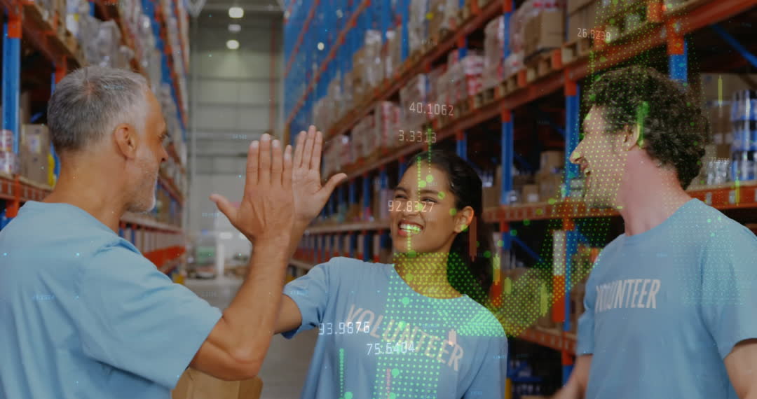 Scene captures smiling volunteers sharing a high five in a warehouse setting. Digital overlay suggests themes of technological integration with teamwork and logistics. Useful for promoting community service programs, teamwork and collaboration initiatives, and technological advancements in logistics.