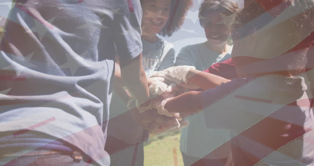 - Diverse Volunteers Stacking Hands with USA Flag Overlay