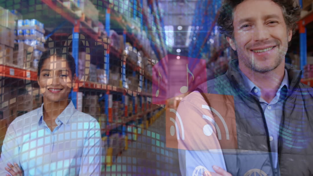 Diverse Warehouse Supervisors Overlaid with Tech Icons Video