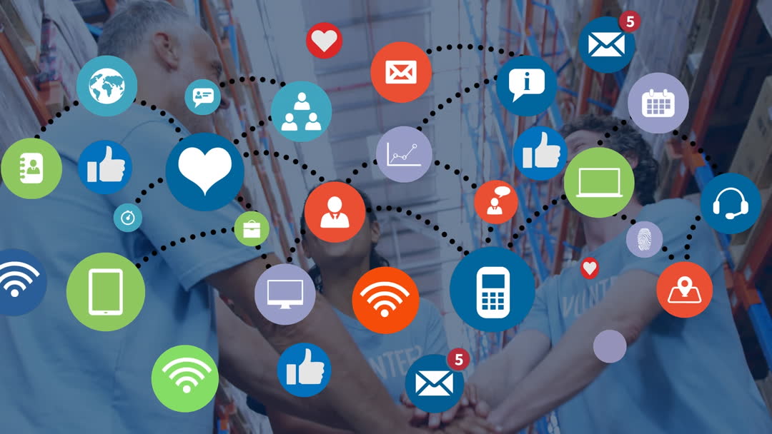 Diverse Warehouse Team Bonding with Digital Communication Icons Video