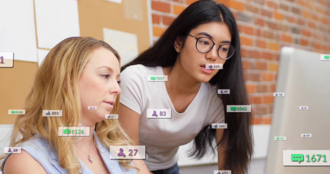 Two diverse female coworkers engage in a discussion while observing report statistics and social media notifications on a computer. Both women appear focused as digital interaction bars overlay the scene, suggesting activity in a modern office environment centered around technology and social media engagement. Ideal for illustrating themes of collaboration, business planning, and digital trends in professional settings.