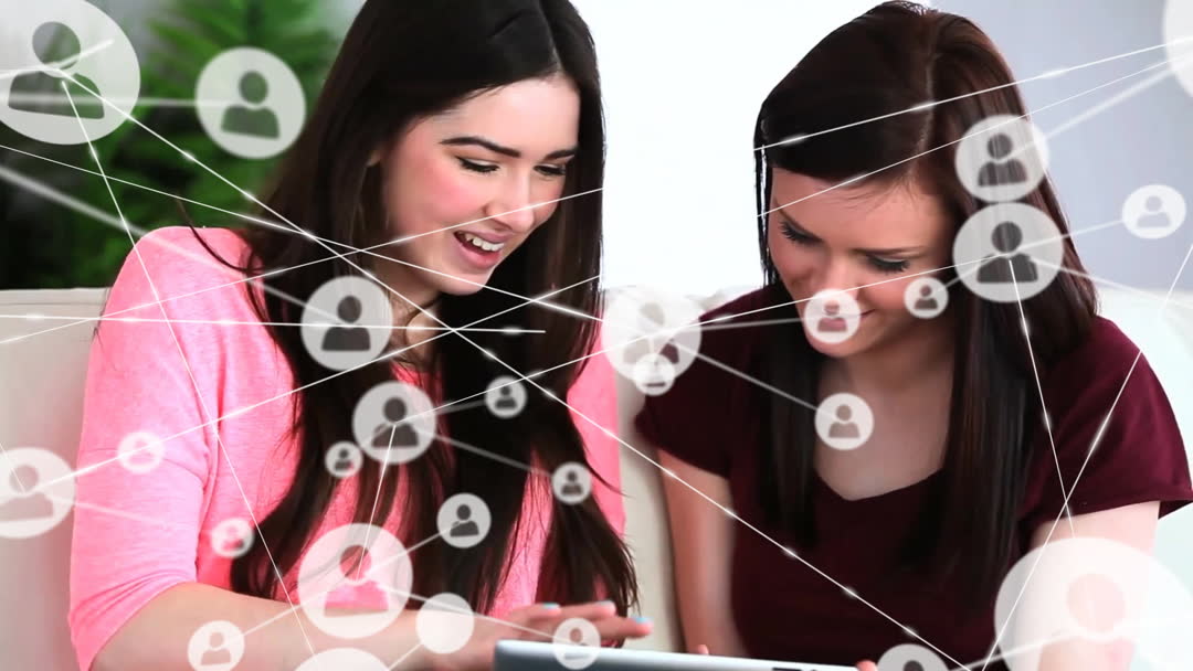 Two diverse women working together in an office setting, focusing on a digital project. Overlaid icons represent social and business networks, highlighting themes of collaboration and connectivity in technology. This video can be used for marketing tech solutions, presentation materials, networking events, and articles promoting digital teamwork and innovation.