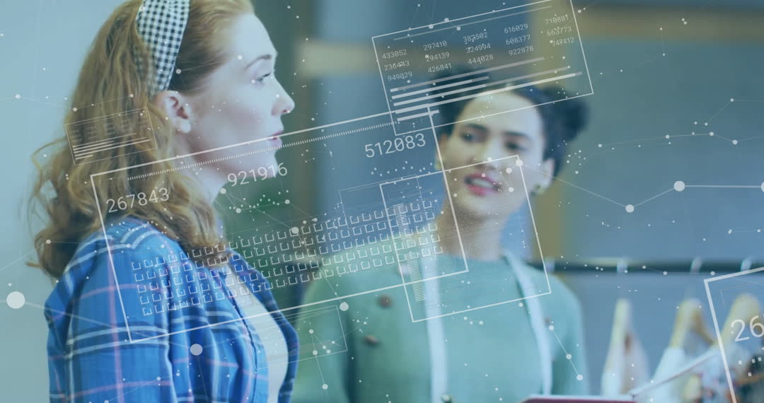 - Diverse Women Collaborating with Digital Data Overlay in Office