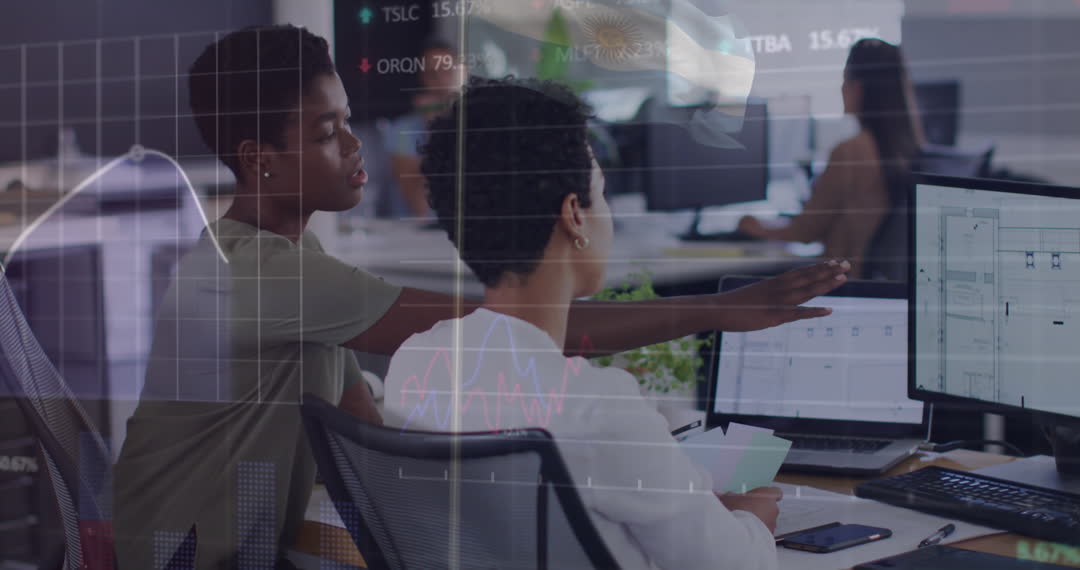 Two women collaborating in a sleek office setting, interacting with digital animations of stock market and statistical data. Ideal for visuals related to data-driven business environments, teamwork in diverse workplaces, technological influence in modern offices, or global economic discussions.