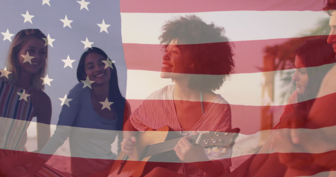 Scene depicts group of diverse women playing guitar and enjoying time at beach with American flag overlay. Captures essence of friendship and unity against a patriotic backdrop. Ideal for themes of national pride, cultural diversity, and celebrating American identity in multicultural settings.