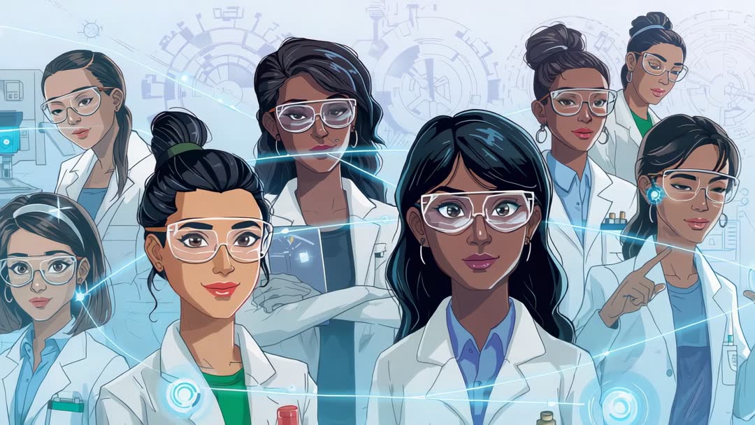 AI Generated Image. Video showcasing diverse group of women scientists wearing lab coats and safety goggles, activating holographic network while analyzing tablet-based data. Scene featuring interconnected light nodes, virtual interfaces, and collaborative postures, communicating teamwork, innovation, and advanced research. Footage functioning well for corporate presentations, technology and biotech websites, STEM education materials, diversity and inclusion campaigns, conference openers, and social media promos. Serving as hero clip for product launches, powering explainer videos for AI and data platforms, and providing background visual for science outreach and recruiting campaigns. Offering loopable versions and short-edit friendly cuts for promotional timelines and multimedia projects.
