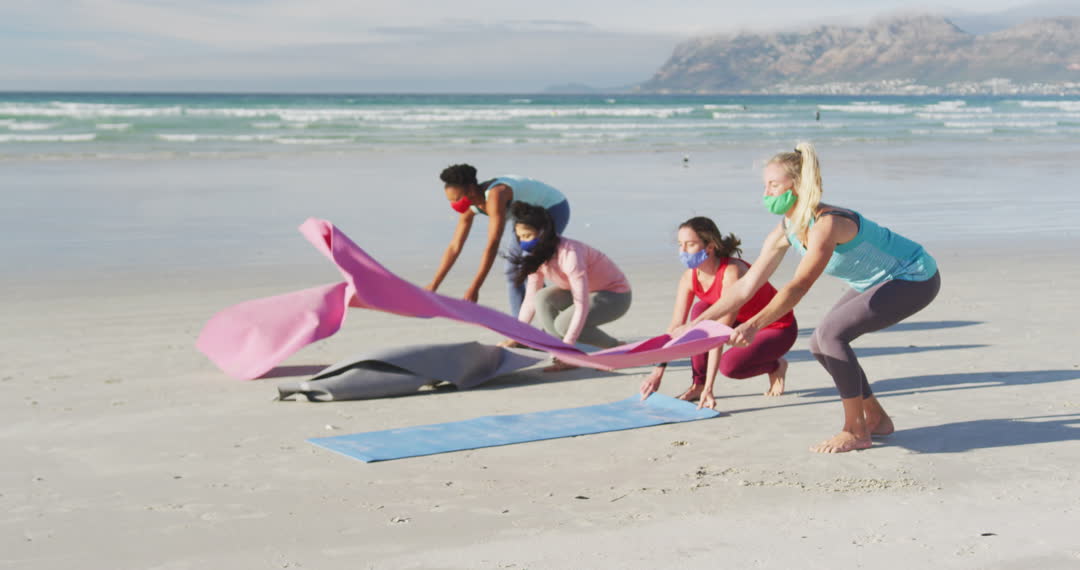 - Diverse Women Unrolling Yoga Mats on Beach Wearing Face Masks