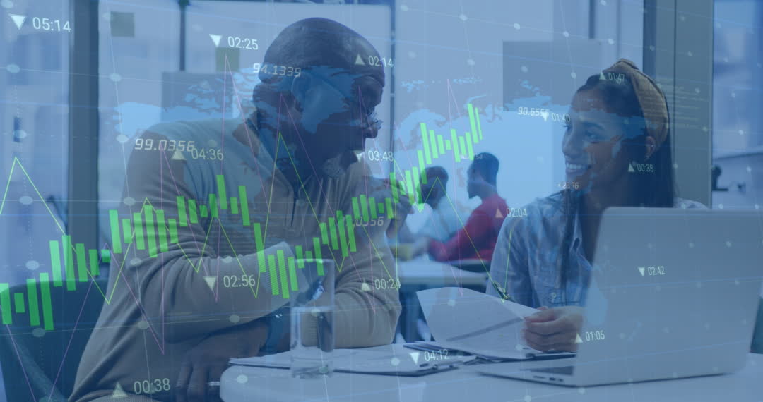 Man and woman in office analyze financial data on laptop with digital charts overlay. Ideal for concepts of teamwork in a tech-savvy business setting, innovation, data-driven decision-making. Perfect for marketing campaigns, business presentations, and articles about collaborative workplace environments and technical professionals collaborating.