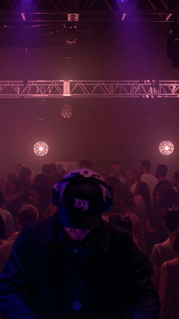 AI Generated Video. Dark, atmospheric vertical video showing DJ mixing on decks while wearing cap and headphones. Haze and pulsing lights creating moody, neon-lit vibe as crowd silhouettes fill dancefloor. Camera framing from behind DJ, focusing on mixer controls and turntables in foreground and crowd reactions beyond. Suiting social media vertical formats including Instagram Reels, TikTok, Snapchat, and mobile ads for fast, immersive storytelling. Usage ideas: powering club promotion, anchoring event recap, bolstering DJ portfolio, teasing electronic music release, supporting concert visuals, enhancing nightlife blog header, promoting beverage and fashion brands. Editing suggestions: syncing cuts to beat, adding motion graphics and logo overlay, applying magenta-purple color grade and soft highlights for cinematic feel. File notes: vertical 9:16 frame from live performance suitable for mobile distribution. Talent release may be required for recognizable faces.