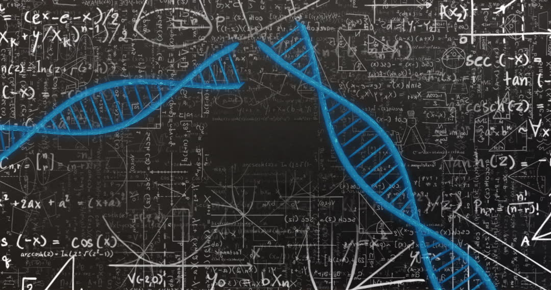 Visual representation of DNA strands superimposed on a chalkboard filled with diverse mathematical equations and symbols. Ideal for illustrating themes related to genomic research, scientific analysis, or educating on the intersection of mathematics and biology. Useful for textbooks, scientific presentations, educational posters, or technology-based content.