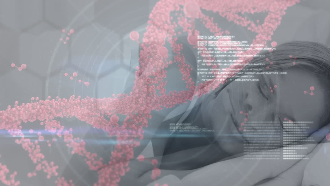 Composite videory merging DNA helix visuals with complex code superimposes on a Caucasian woman enjoying restful sleep. Representation of genetic networking, advancing technology, and biomedical exploration. Fits contexts like scientific progress, technological innovations, biotech advertising, and educational demonstrations on genetics and technology.