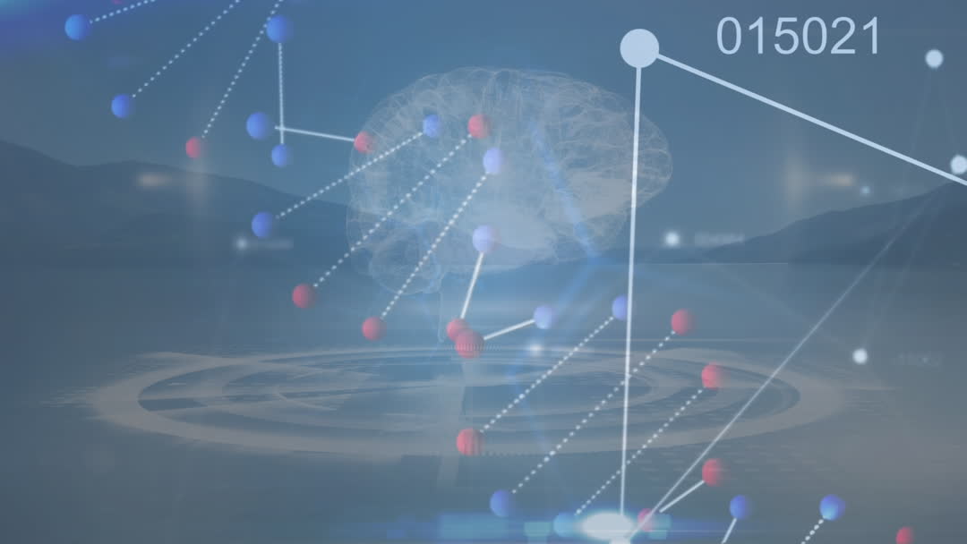 Futuristic digital landscape showcasing genetic sequence analysis with a visual representation of a brain. Ideal for use in scientific, technological, or healthcare-related content, illustrating advanced research or digital solutions.