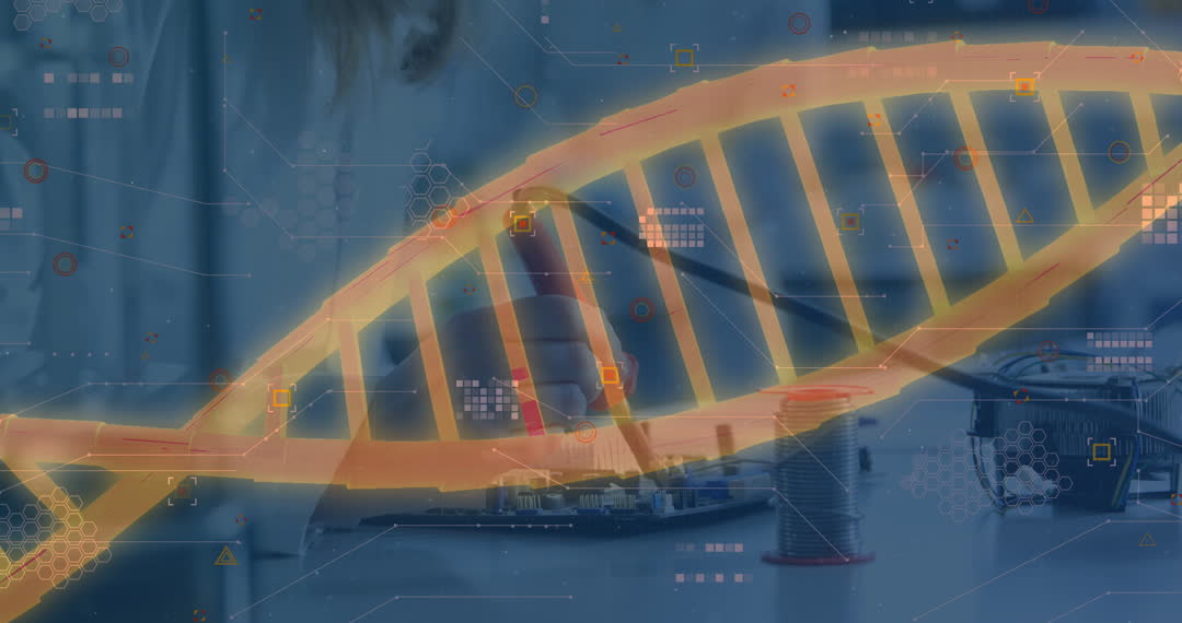Dynamic visualization of a scientist engaged in laboratory work with an overlay of a spinning DNA strand and various data processing graphics. Ideal for use in biotechnology and genetic research contexts, emphasizing advancements in science and technology. Useful for articles, presentations, and educational material about scientific innovation and data analysis in genetics.