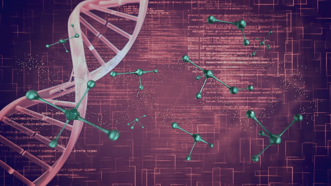 Visual depicting interplay between genetic information and molecular structures. Ideal for use in discussions about biotechnology innovations, genetic research breakthroughs, scientific advancements, and education materials on biology and data processing.