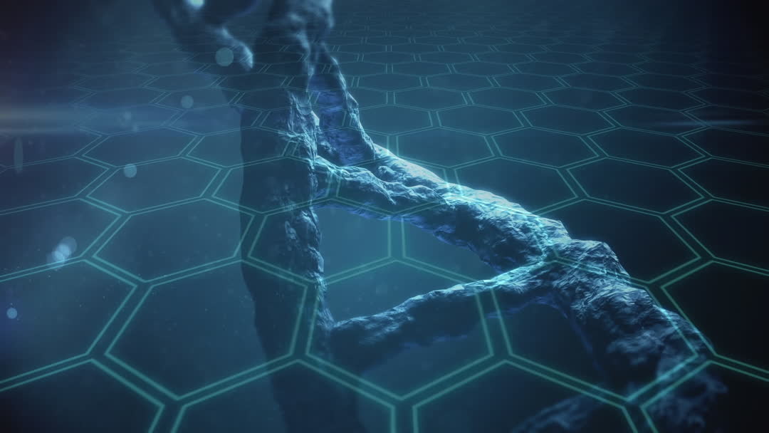 Animated depiction of a DNA molecule revolving amidst a framework reminiscent of blue hexagons. This modern visualization often represents advanced genomic studies, extraordinary innovation in medical research, and advancements in healthcare technology fields. Suitable for usage in scientific presentations, medicine symposiums, educational materials focusing on deoxyribonucleic acid, or science fiction styled design ideas requiring illustrious molecular designs.