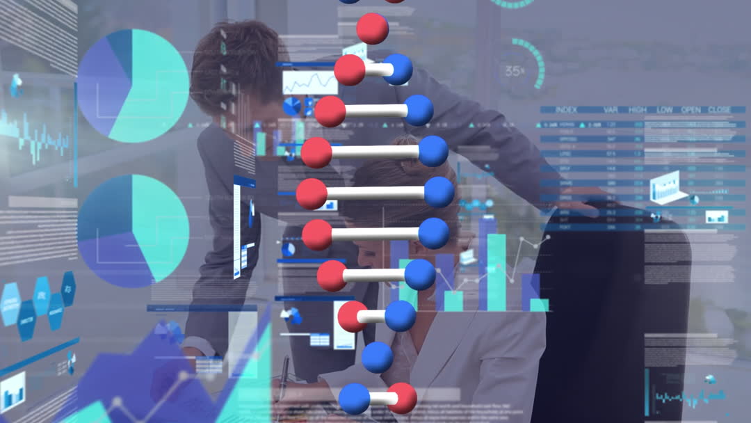 Futuristic video combining DNA structures with digital analytics emphasizes the intersection of biotechnology and business. Ideal for use in content relating to innovations in health tech, data analysis trends, or articles related to business intelligence and genomic data application.