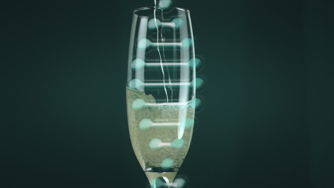 DNA Strand Overlay on Glass of Champagne Highlighting Celebration Video