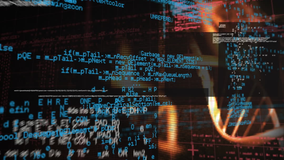 Digital representation combining DNA strands with lines of code, suggesting themes of biotechnology, genetic engineering, and scientific research. Ideal for media related to data science, bioinformatics, or tech innovations. Useful for articles or presentations on how digital and biological sciences intersect.