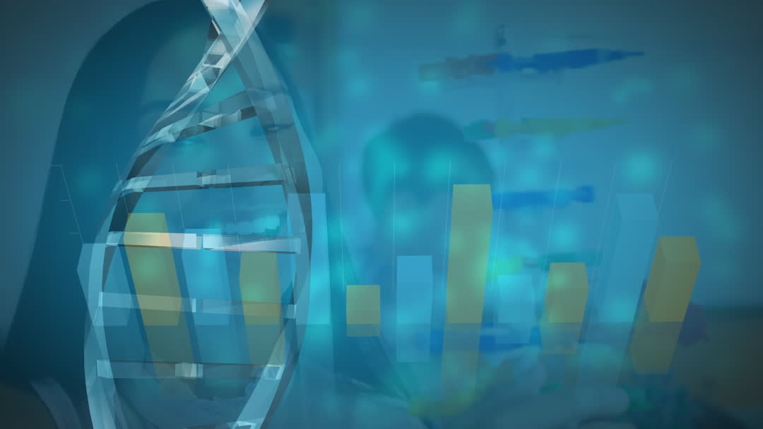 Combining elements of DNA strands and graphical data representations, this video visualizes the intersection of genetics and data analytics. Useful for biotechnology presentations, scientific research reports, or educational materials illustrating genetic studies and data visualization techniques. The animation implies modernity in digital analysis and the blend of science and technology.