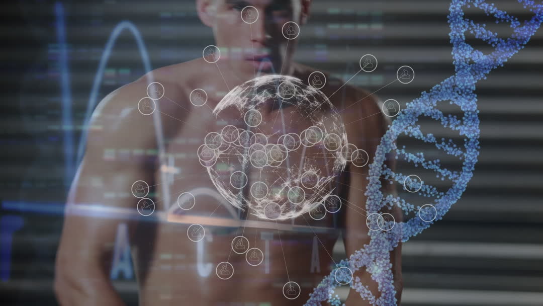 Depicts a motion of a globe and DNA structure overlaying a gently blurred male boxer in a gym. This visual connects the themes of advanced technology and athletic training, illustrating innovational crossover between sports and biology. Suitable for promoting scientific articles, fitness materials, or sports tech discussions especially those focusing on human potential and health advancements.