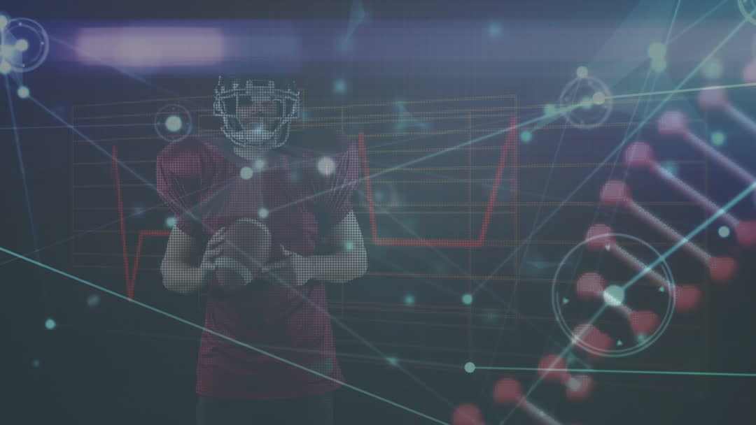 Image displays technological integration of a rugby player with elements like DNA strands and data processing graphs, symbolizing the use of advanced analytics and biotechnology in sports. Useful for illustrating concepts in sports science research, bioinformatics applications in athletics, or technological advancements in athletic performance enhancement.