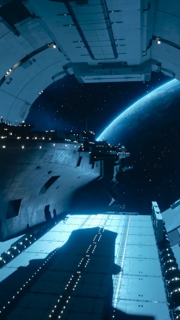 AI Generated Image. Showing vertical docking sequence unfolding inside ringed spaceport hangar, camera panning from illuminated deck toward massive hull and crescent planet on horizon. Ring throat opening revealing exterior surfaces, deck lights forming approach corridor against dense starfield. Featuring cool blue lighting, high-contrast silhouettes, and cinematic scale for dramatic visual storytelling. Serving as background for film trailers, game cinematics, science fiction promos, vertical social ads, YouTube Shorts, TikTok, and app intros. Serving as background for title cards, splash screens, corporate tech presentations, space exploration editorials, and concept design portfolios. Providing easily loopable footage for seamless transition shots, motion design projects, and VFX plate work.