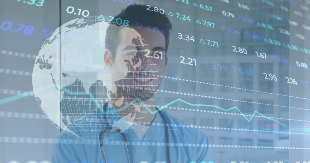 Visual illustrates integration of healthcare with global financial data representation. Ideal for topics demonstrating technological advances in medicine and finance, data analysis in healthcare, and global connections.