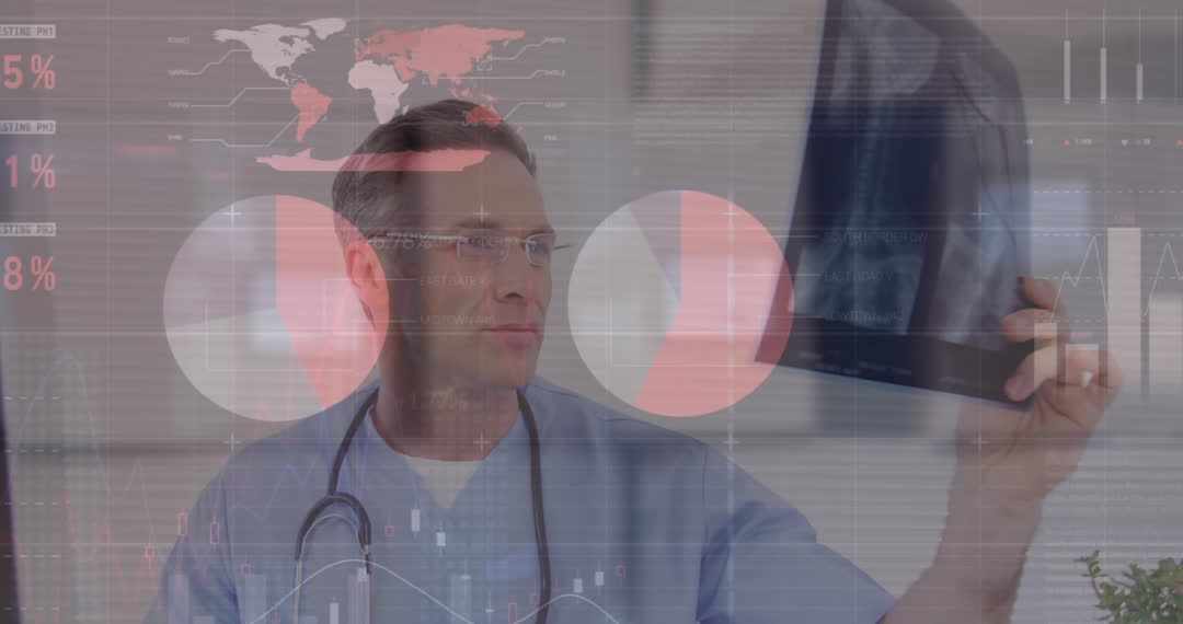 Caucasian male doctor holding and examining an X-ray against a backdrop of data overlays, symbolizing integration of healthcare and technology. Useful for illustrating modern medical innovations, technology in healthcare settings, and advancements in digital health solutions.