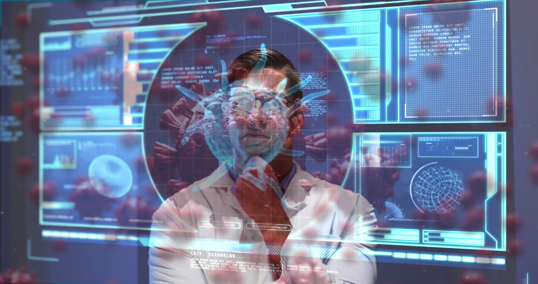 Caucasian male doctor analyzing COVID-19 data on a holographic digital interface, illustrating the integration of technology in healthcare research. The overlay of virus cells and complex data visualizations emphasizes the importance of data in tracking and combating the global pandemic. This video is suitable for use in articles about medical technology, pandemic research, healthcare innovations, or data analysis in epidemiology.