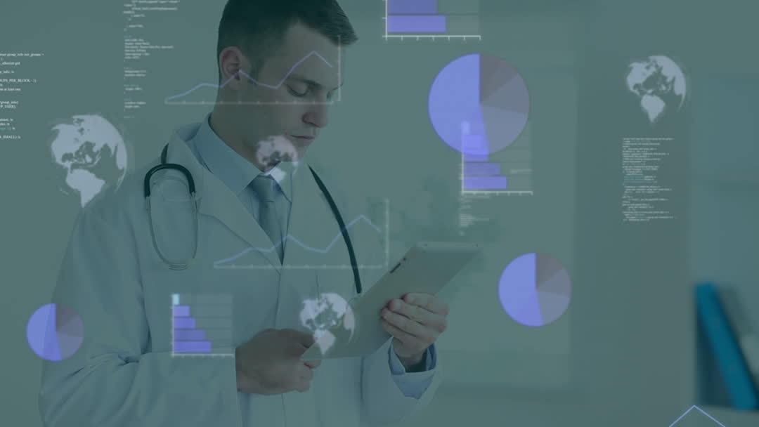 - Doctor Analyzing Data on Digital Tablet with Statistical Overlays