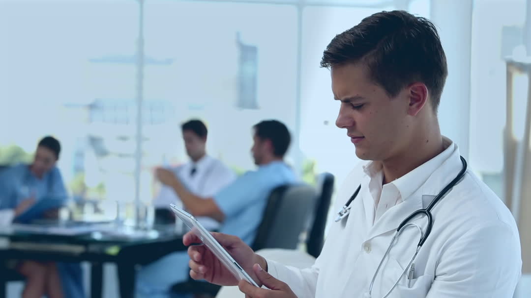 Caucasian male doctor reviewing important information on a digital tablet in a hospital environment. Other healthcare professionals in the background collaborate and discuss. This professional video illustrates modern healthcare technology and teamwork, ideal for use in medical websites, healthcare brochures, or technology seminars.