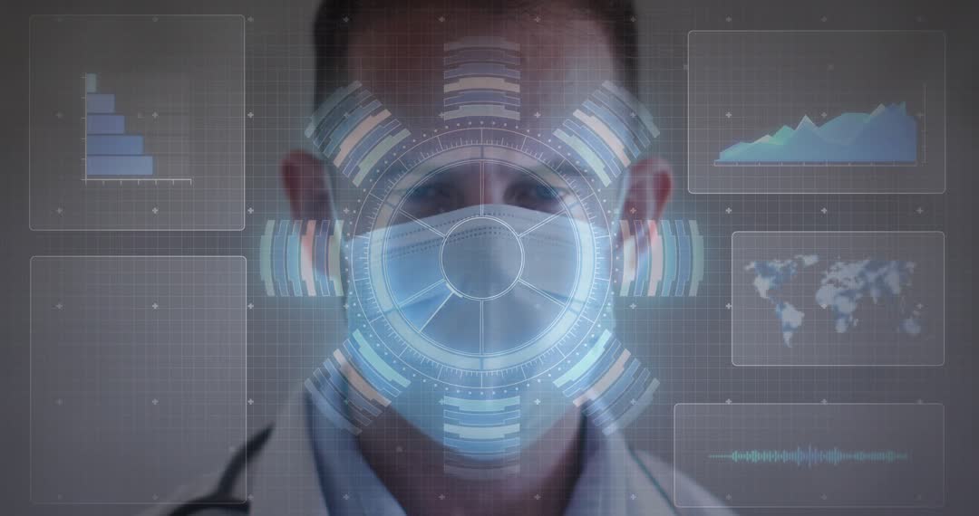 A male doctor, wearing a mask, positioned against a gray background engages with a high-tech medical interface. The rotating digital segments and accompanying data visuals symbolize cutting-edge healthcare solutions and innovations. This video frame is suitable for illustrating advancements in medical technology, digital healthcare innovations, data analysis in medicine, and futuristic medical diagnostics. Ideal for use in medical journals, technology videos, healthcare webinars, or innovative healthcare solutions content.