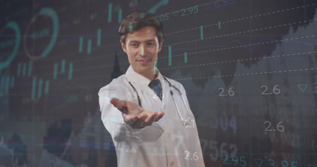 A doctor in a white coat is interacting with a digital interface filled with financial statistics and graphs. This visual represents the intersection of healthcare and finance, showcasing the use of data analytics in modern medicine. Ideal for articles or advertisements about technological advancements in healthcare, data security, or health informatics.