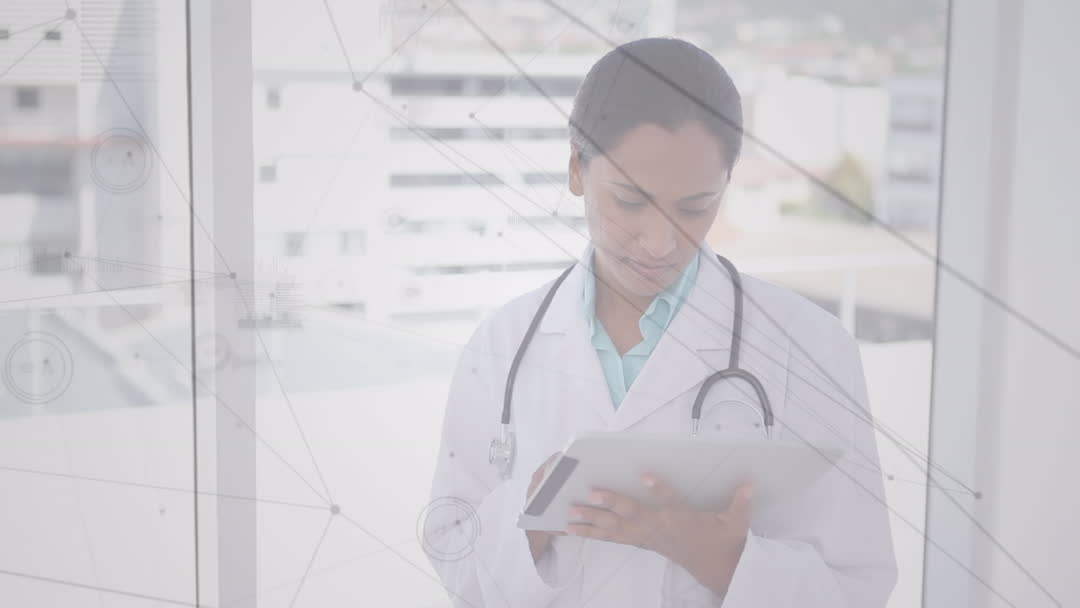 A doctor uses advanced digital tools with an overlay of network connections in a healthcare setting. Perfect for illustrating modern medical technology, digital healthcare solutions, and innovation in medicine. Suitable for articles on healthcare advancements or marketing of medical tech products.
