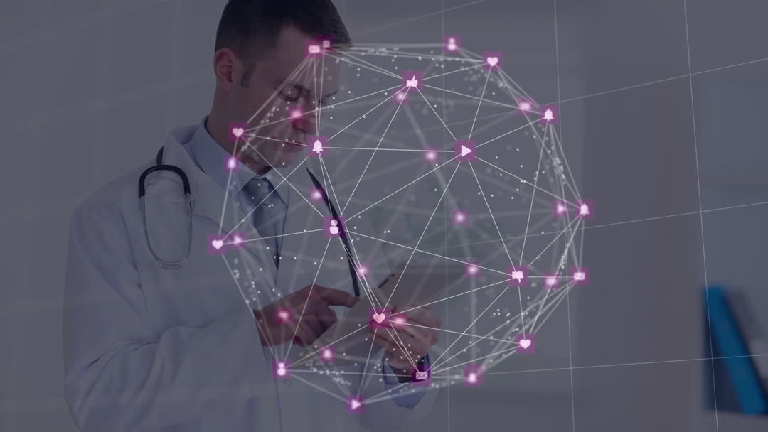 This video depicts a doctor engaging with a digital interface representing a network of connections, implying the use of technology and data in healthcare. Useful for illustrating concepts in medical technology, innovation, and data-driven health solutions.