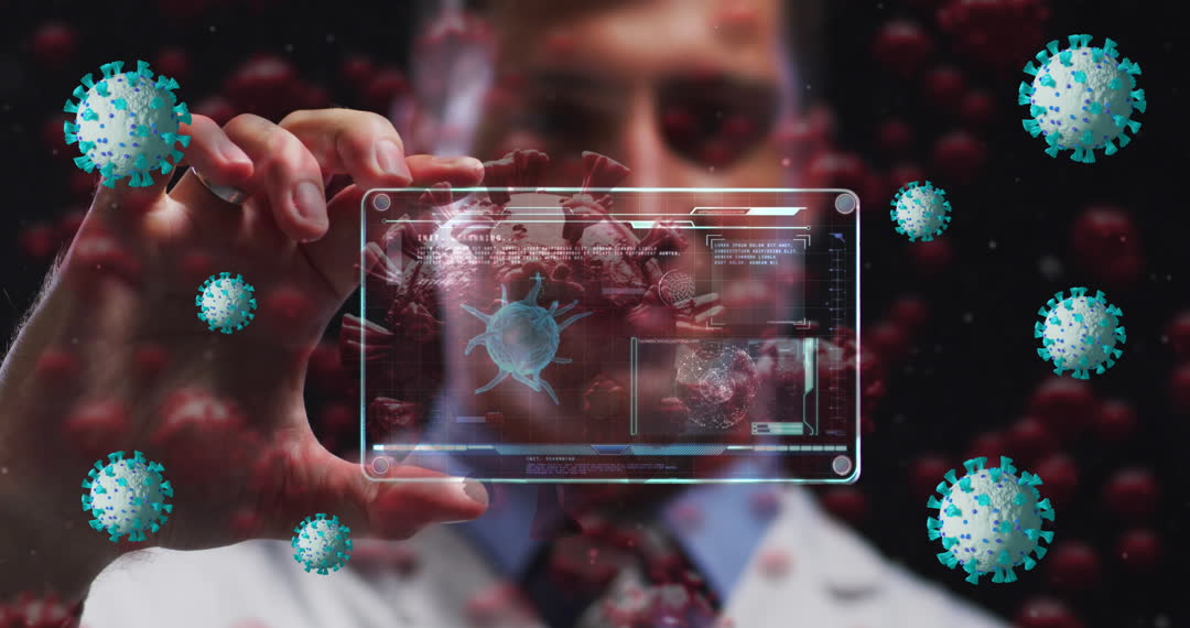 Conceptual visualization of a male doctor interacting with a digital interface displaying virus data, highlighting advancements in medical technology during the COVID-19 pandemic. This can be useful for depicting innovative approaches in healthcare, technology in medicine, or educational materials on the pandemic and viral analysis.