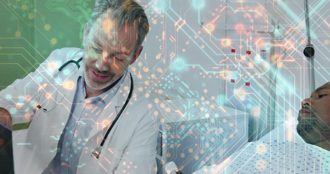A male doctor wearing a stethoscope checks a patient's pulse, symbolizing thorough medical examinations combining traditional techniques with advanced digital technology. Background circuits and digital interface contain technological, futuristic themes. Perfect for medical, healthcare, and technological innovations contexts or showcasing digital healthcare advancements and patient care. Keywords cover aspects of healthcare and technology convergence with an emphasis on expert diagnostics in a clinical environment.
