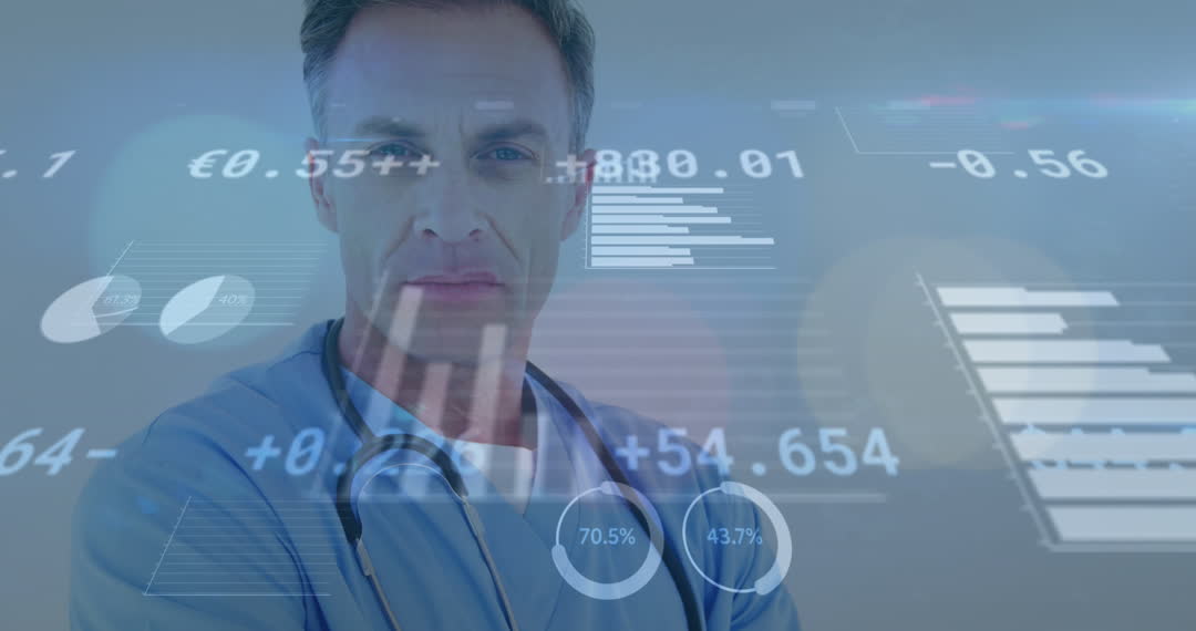 Caucasian male doctor appears surrounded by animated statistical graphs and financial figures, symbolizing integration of finance and healthcare. Use for promoting financial solutions, healthcare technologies, or innovative approaches in clinical environments. Suitable for articles discussing the role of data in medical decision-making and business investments in healthcare.
