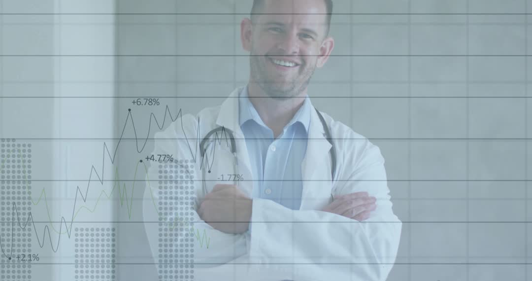 Medical professional in white coat with crossed arms engages with animated health analytics charts displaying percentages and trends. Suitable for illustrating advancements in healthcare data analysis and clinical diagnostics. Ideal for use in health tech articles, medical journals, or promotional materials highlighting the role of data analytics in modern medicine.