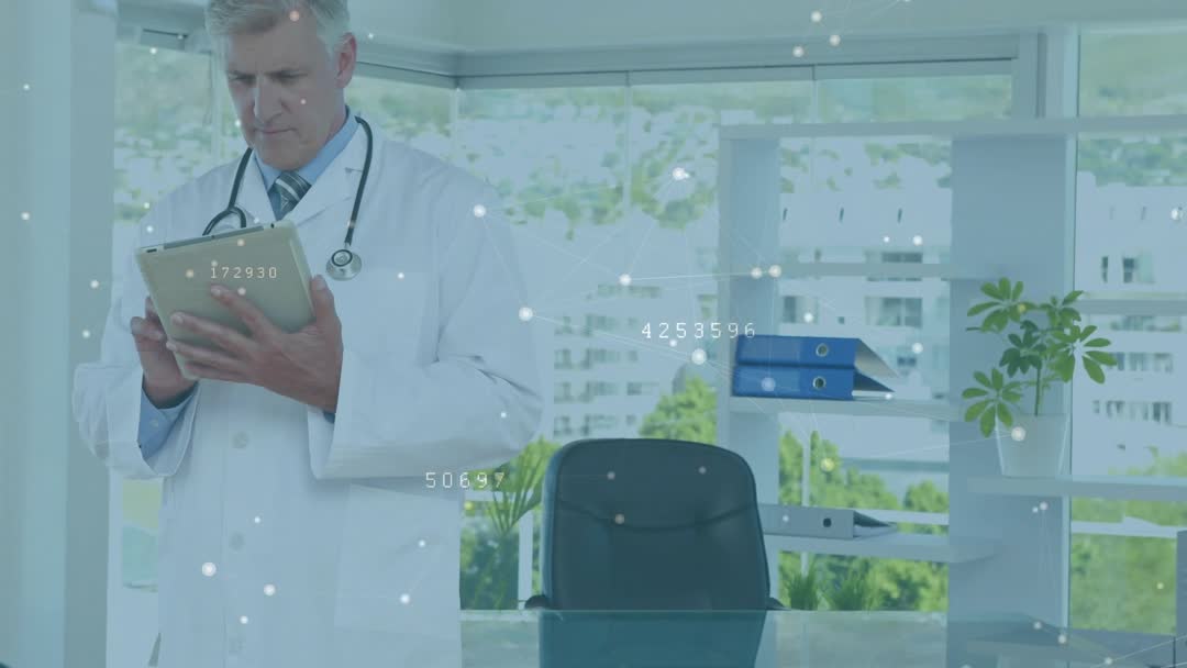 Doctor Analyzing Medical Data on Tablet with Floating Metrics Video