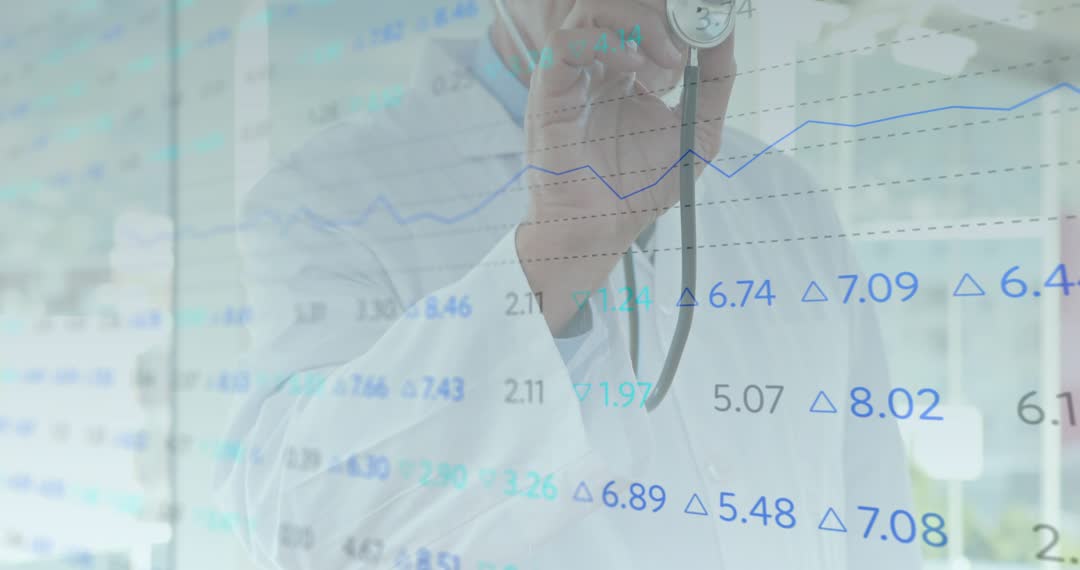 Video showing physician lifting stethoscope while inspecting diaphragm against layered transparent data overlay with rising line charts and numeric metrics. Foreground featuring white coat and stethoscope, background showing blurred clinic corridor, creating professional clinical atmosphere. Visual style blending medical tools with financial-style analytics for conveying health data analysis, performance tracking, predictive diagnostics. Useful for illustrating healthcare analytics, telemedicine, clinical research, hospital operations, medical technology marketing, investor pitch decks. Suitable for presentation openers, website hero banners, educational videos, training modules, corporate reports, social media promotion. Color palette emphasizing cool blues and muted tones for modern tech feel. Editing suggestions: using slow zoom, subtle parallax between doctor and data layers, overlaying explanatory text or voiceover describing metrics.
