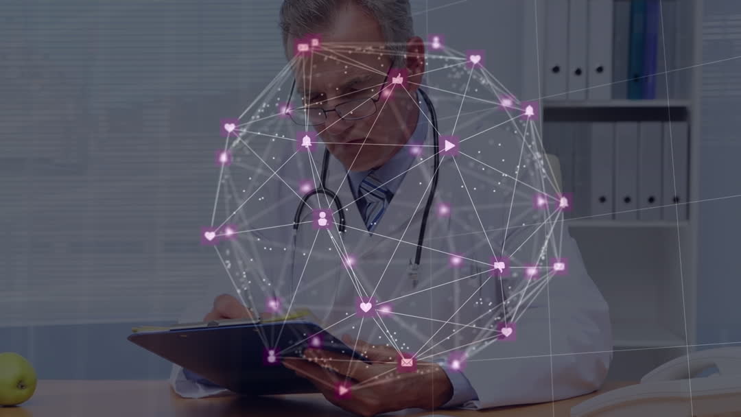 Doctor using digital technology and networking visuals in office indicates integration of advanced data processing in health care settings. Useful for illustrating innovation in medical technology, showcasing data-driven diagnostics, or emphasizing connectivity in modern healthcare processes.