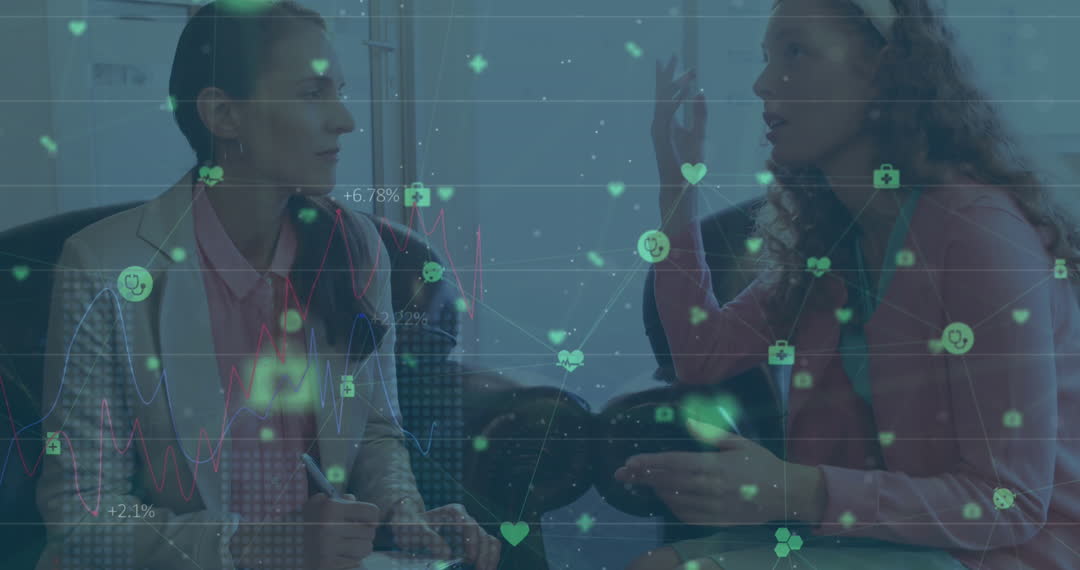 This scene shows a female doctor engaging in mental health conversation with a patient, overlayed with digital data graphics depicting medical and communication icons. The dual exposure enhances the connection between traditional healthcare interactions and modern technological interfaces, ideal for illustrating concepts around digital healthcare, modern therapy practices, and the integration of data in healthcare services.
