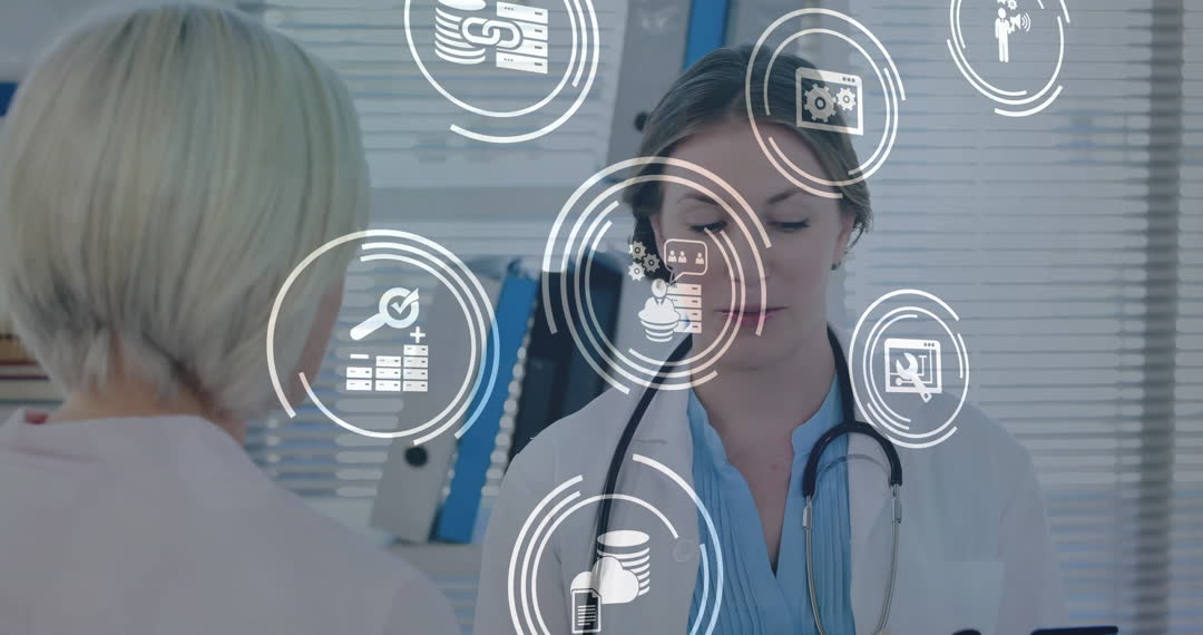 A healthcare professional collaborating with a patient, superimposed with icons representing technology and innovation in healthcare. The video conveys themes of modern medical practice, digital integration, and patient care. Ideal for illustrating concepts in healthcare innovation, digital medical tools, and futuristic consultation methods.