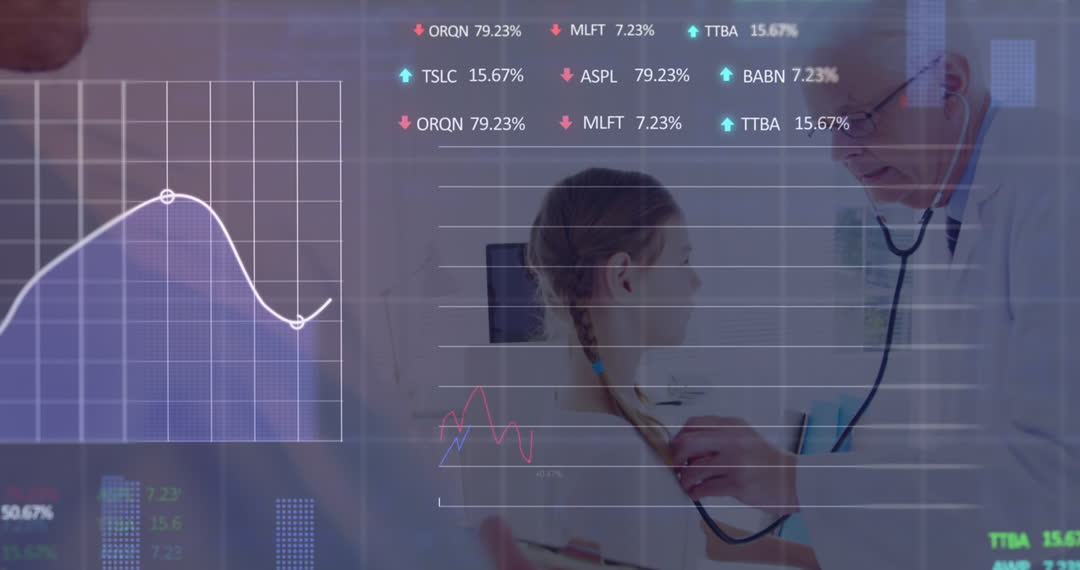 A doctor using a stethoscope to check a young patient amidst animations of financial data and stock charts. This video symbolizes the intersection of healthcare and technology, illustrating concepts such as medical data analytics, the modernization of medical practices, and the integration of business strategies in healthcare organizations. It is useful for articles, presentations, or websites addressing innovative healthcare solutions, the use of data in medical advancements, or the business aspect of the health industry.
